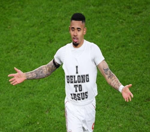 据《伦敦足球》报道,阿森纳前锋热苏斯在4-1大胜阿斯顿维拉的比赛中打进本赛季首球,随后脱衣庆祝,露出T恤内侧“I belong to Jesus”字样,这一举动可能违反英足总规则,或面临处罚。